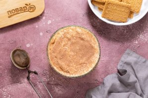 Присыпьте сверху какао-порошком. Накройте крышкой или затяните пленкой. Уберите в холодильник минимум на 4 часа, можно оставить на ночь.