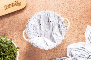 Горшочек накройте фольгой с проделанными отверстиями, чтобы выходил пар или просто крышкой, но тогда время приготовления будет чуть дольше.