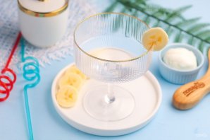 Украсьте бокал для коктейля одним или двумя кружочками банана. Тщательно отпюрируйте все содержимое емкости блендера до получения пышной пены.