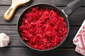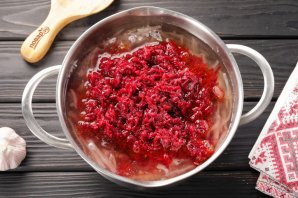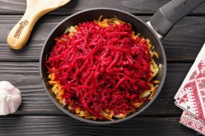 Свеклу натрите на крупной тёрке. Добавьте в сковороду.