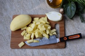 Нарежьте картофель средними кубиками. Измельчите половинку средней луковицы.