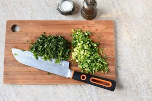 Пока картофель варится, нашинкуйте зелень. Одной порцией — шпинат и все стебли от лука, укропа и петрушки. Второй — листья укропа и петрушки.