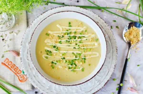 Выдавливаем чеснок прямо в суп, мелко рубим кинзу и добавляем её вместе с измельчёнными орехами.