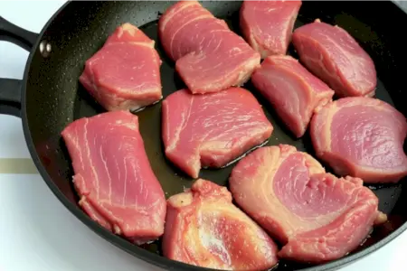 Нарезанное мясо сложить в глубокую ёмкость и добавить 2-3 ст. ложки пшеничной муки. Хорошенько перемешать. Каждый кусочек должен быть запанирован в муке.