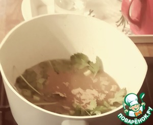 Сначала готовим бульон. В небольшой ёмкости смешиваем веточки кинзы, имбирь, сахар, зелёный лук и воду. Доводим до кипения, затем оставляем томиться на медленном огне 8-10 минут до появления ароматности. 60 мл бульона уходит в соус.
