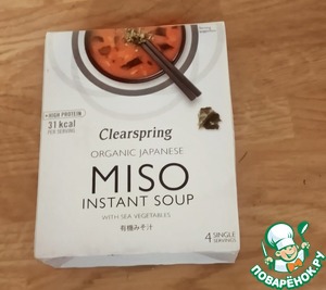 - Бульон (рыбный или из морепродуктов. У меня бульон мисо, сделанный из водорослей) — 275 мл