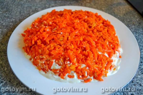 Потом слой вареной морковки и снова щедрый слой рыбы и творожка. А сверху слой желтков от тех же пяти яиц. И готово. Но рыбу я в следующий раз возьму менее жирную.