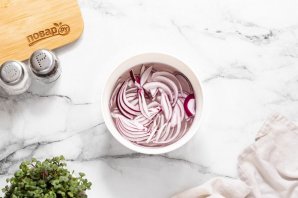 Красный лук нарежьте перьями. Опустите в холодную воду на 10 минут, чтобы убрать остроту. После слейте воду, а лук обсушите с помощью бумажных салфеток.