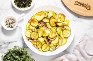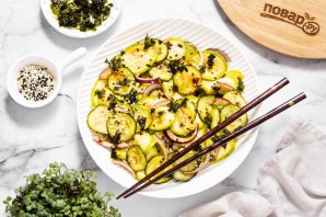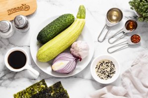 Ниже я расскажу подробнее, как приготовить азиатский салат из кабачка. Кабачки выбирайте молодые, с тонкой кожурой и нежными мелкими семенами. Можно взять цукини. Из зелени можно добавить в салат зеленый лук или кинзу, если любите. Салат получается сочным, легким и свежим. Готовится очень просто и быстро, но потребуется немного времени, чтобы салат промариновался.