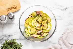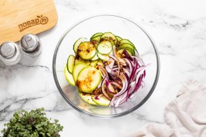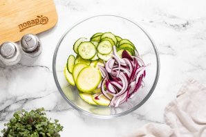 Переложите в глубокую миску кабачок, огурец и красный лук.