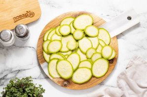Нарежьте кабачок с помощью терки мандолины на тонкие кружочки.
