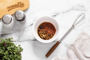 Соедините все жидкие ингредиенты для заправки. Добавьте пропущенный через пресс чеснок и перец хлопьями. Перемешайте до однородности.