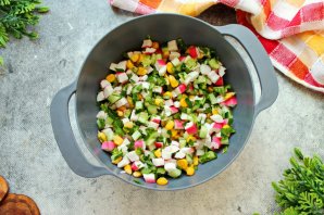Крабовые палочки освободите от оболочки и порежьте кубиком, величиной как нарезан огурец. Добавьте их к овощам.