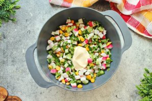 Заправьте салат майонезом, перемешайте и подавайте на стол.