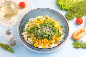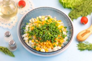 Мелко нарежьте промытый зеленый лук и добавьте его тоже в емкость. По желанию можно дополнить салат измельченной зеленью укропа, петрушки, если вы любите их в приготовленных блюдах.