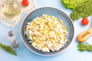 Отварные яйца очистите от скорлупы и промойте в воде, исключая попадание даже маленького кусочка скорлупы в салат. Нарежьте их мелким кубиком и высыпьте в глубокую миску или салатник.