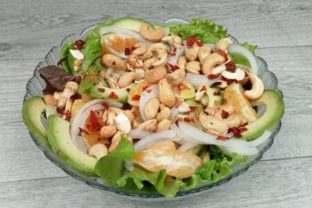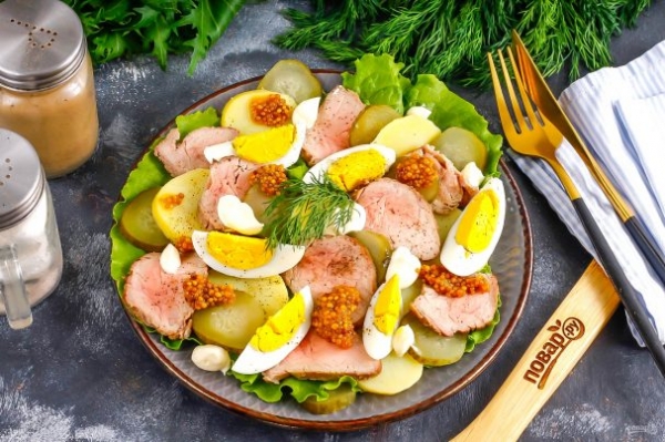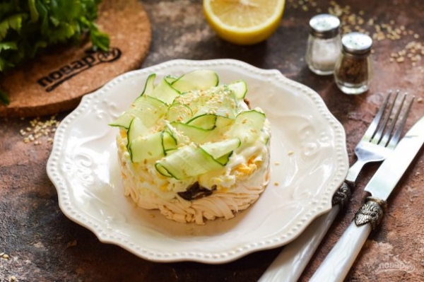 Выложите в салат оливки. Заправьте салат майонезом или маслом, добавьте соль и перец по вкусу.