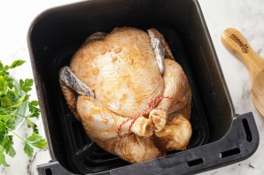 Подготовьте все ингредиенты по списку. У меня аэрогриль с чашей на 6,5 литров, в неё поместится курица до двух килограммов. Я взяла целую тушку весом 1,5 кг. Если чаша вашего аэрогриля 3-4 литра, то вам нужно взять курицу весом не более 1,2 кг.