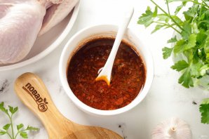 В глубокой тарелке соедините все ингредиенты для маринада: горчицу, лимонный сок, соевый соус, растительное масло, давленный чеснок, паприку, молотый перец и соль по вкусу. Перемешайте. Чеснока можно взять больше, чем написано в ингредиентах, можно же и вообще от него отказаться, если вы не любите.
