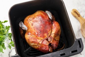 Затем переверните и смажьте остатками маринада. Готовьте ещё 20 минут. После окончания программы проверьте цыплёнка на готовность, если необходимо, увеличьте температуру до 180 градусов и запекайте ещё 10 минут.