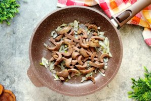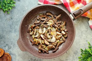 Добавьте в сковороду грибы и обжаривайте до выпаривания жидкости, примерно 7-8 минут, перемешивая.
