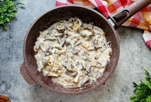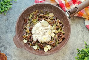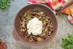 Выложите в сковороду сметану.