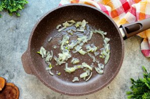 В сковороду налейте растительное масло и разогрейте на среднем огне. Репчатый лук порежьте и выложите в сковороду, обжаривайте в течение 5-6 минут перемешивая.