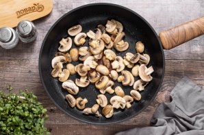Разогрейте сковороду на среднем огне. Обжарьте шампиньоны с растительным маслом около 8-10 минут.