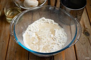 Сначала займитесь тестом. В просторную миску просейте муку, добавьте соль. Перемешайте.