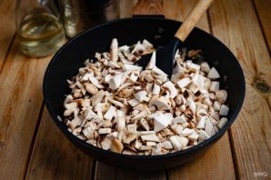 Нарезанные шампиньоны выложите к обжаренному луку и увеличьте огонь до максимального уровня.
