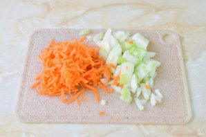 В это время очистите лук и морковь. Потрите морковь на терке, а лук мелко нарежьте.
