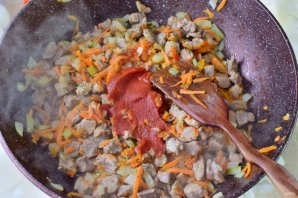 Добавьте к мясу томатную пасту. По вкусу подсыпьте соль и специи.