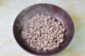 В горячую сковороду налейте немного растительного масла и обжарьте нарезанное мясо 8-10 минут.