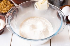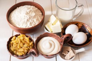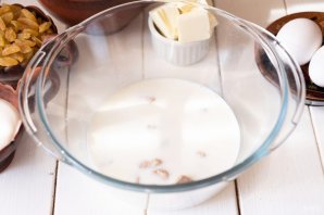 Все ингредиенты соберите по указанному списку. Молоко немного подогрейте в кастрюльке до температуры 35-37 градусов. Изюм промойте и просушите.