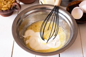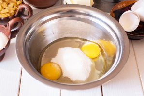 За это время приготовьте сдобную смесь. В миску вбейте яйца и добавьте оставшийся сахар. Перемешайте активно эти ингредиенты венчиком.