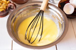 Масло сливочное растопите в сотейнике на маленьком огне и добавьте в миску к сдобной смеси. Вмешайте венчиком.