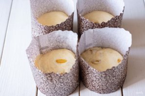 Тесто поделите на части (у меня примерно по 230 грамм) и, каждую часть округлив, поместите в формочку для выпекания куличей, заполняя примерно 1/3 от объема. Оставьте будущие куличи в формах постоять еще на 15 минут.