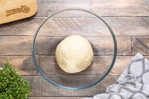 Вымешивайте тесто около 5 минут на столе, затем скатайте в шар. Переложите в миску смазанную растительным маслом. Накройте пленкой и уберите в теплое место на 1 час.