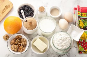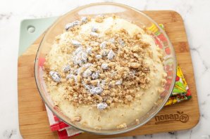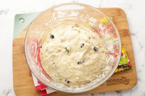 Изюм обсушите и обваляйте в муке. Добавьте к тесту с измельчёнными орехами.