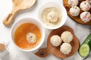 Для панировки подготовьте две мисочки, в одну всыпьте сухари Панко, а в другую — взболтанные куриные яйца. Окуните заготовки сначала в куриные яйца, а затем обваляйте в сухарях.