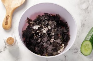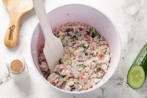 К рису добавьте нарезанный кубиками огурец. Сочную мякоть с семечками лучше не использовать.